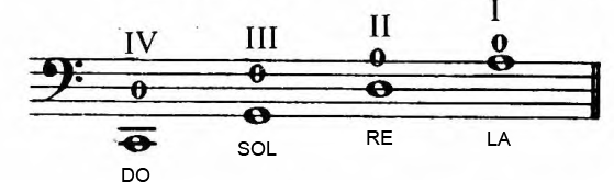 El violoncello tiene 4 cuerdas que tocadas sin pisar con los dedos de la mano izquierda producen los siguientes sonidos: